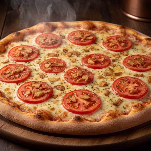 Mussarela, alho frito e rodelas de tomate