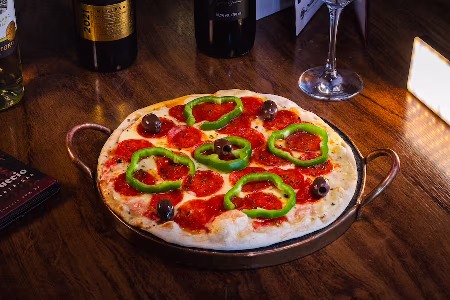 Mussarela, pepperoni, champignon e pimentão